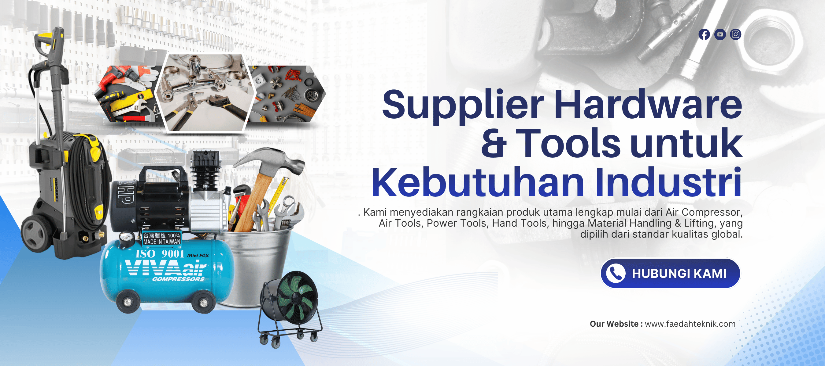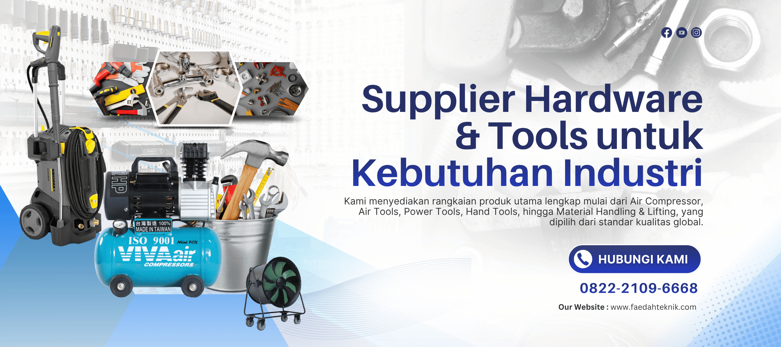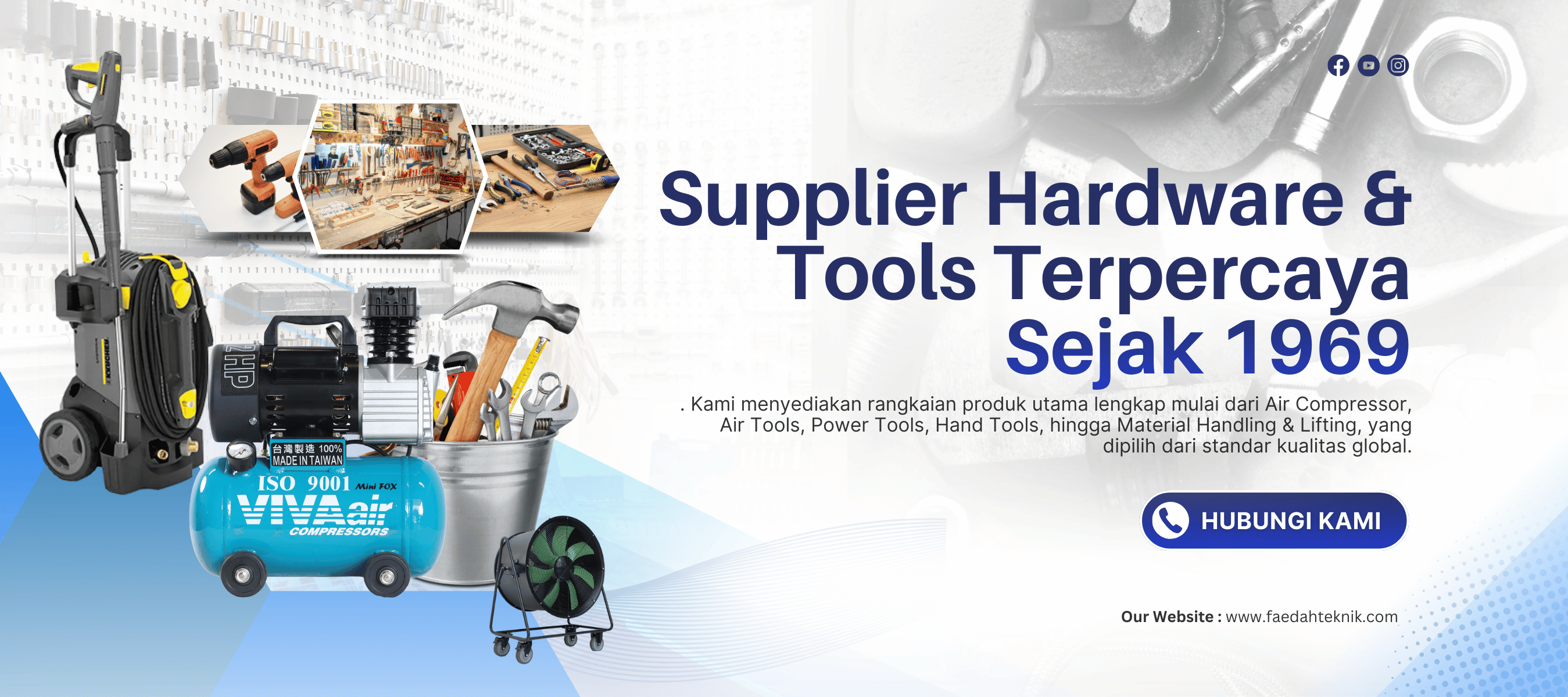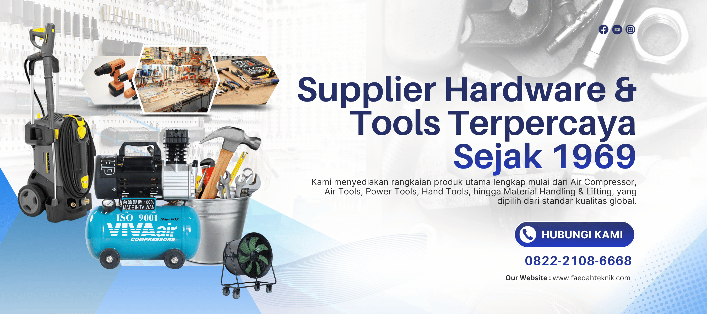 Sejak berdiri pada tahun 1969, Faedah Hardware & Tools hadir sebagai supplier hardware dan tools terpercaya untuk kebutuhan industri, konstruksi, dan profesional. Kami menyediakan rangkaian produk utama lengkap mulai dari Air Compressor, Air Tools, Power Tools, Hand Tools, hingga Material Handling & Lifting, yang dipilih dari standar kualitas global.